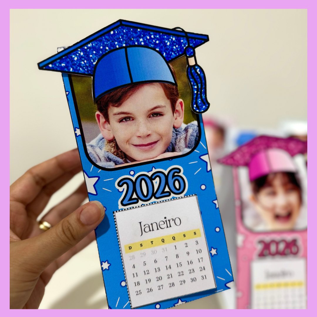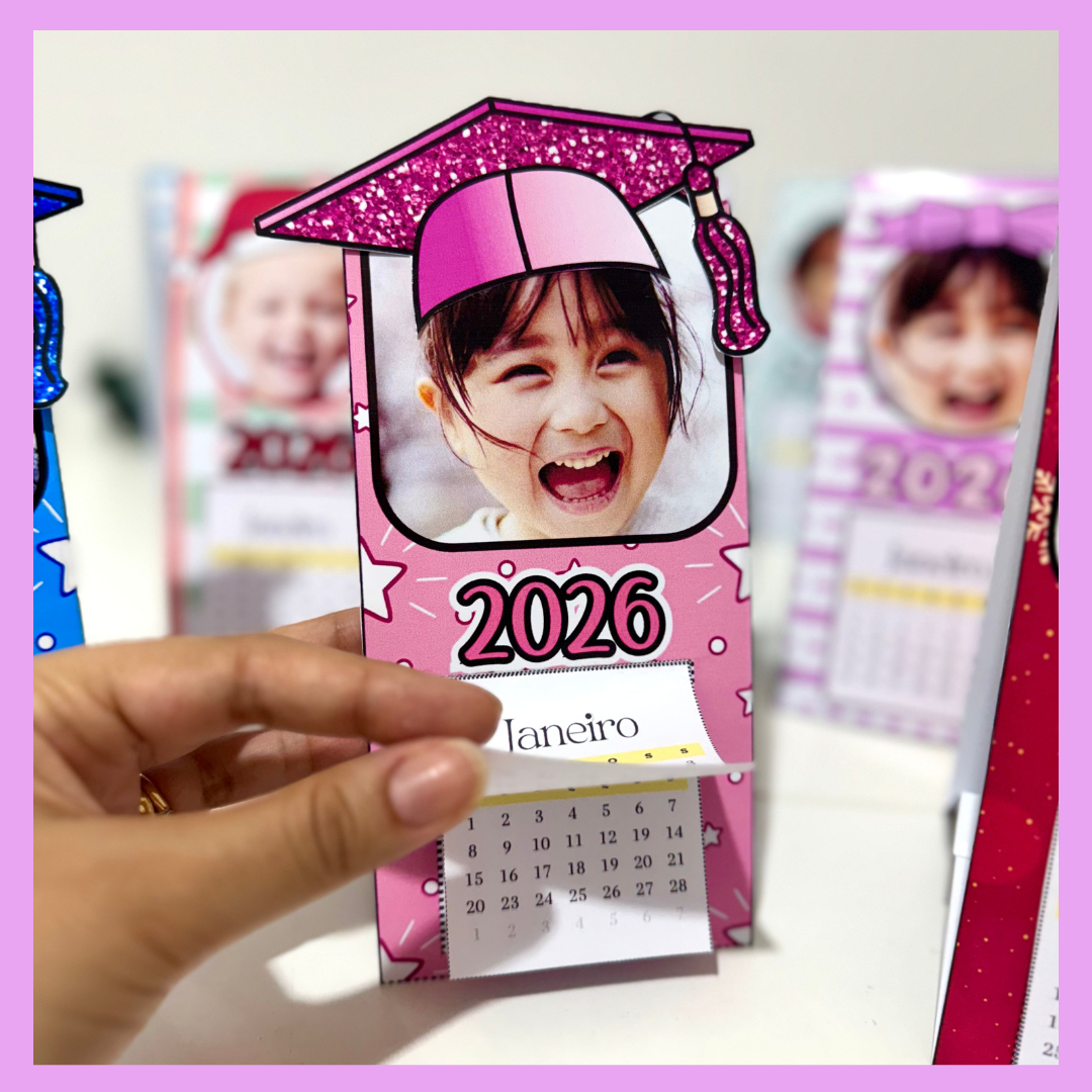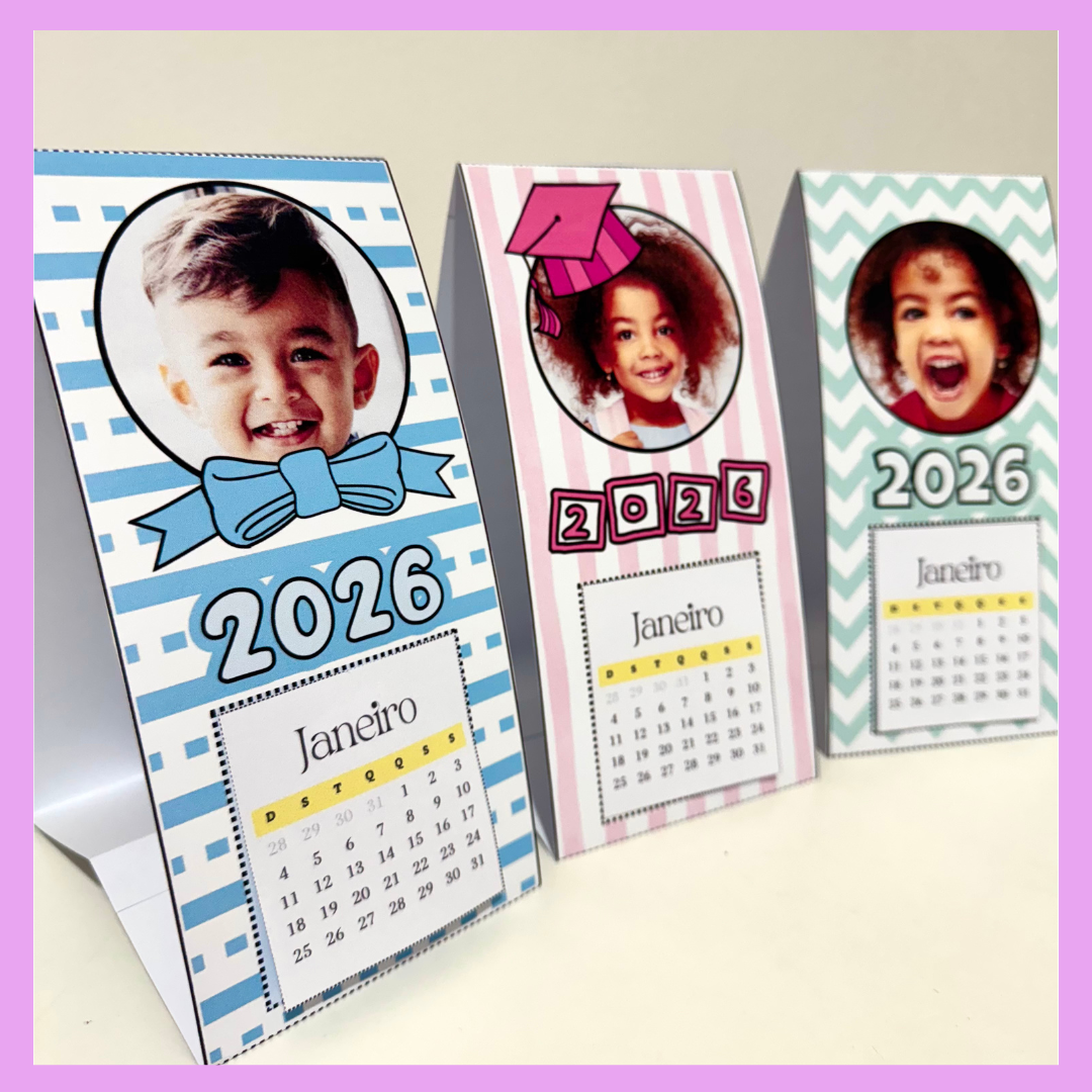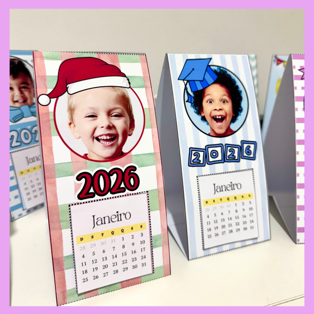 Calendários de mesa 2026 personalizáveis com foto da criança. Essa é uma ótima opção para lembrancinha de final de ano. e cada calendário necessita de apenas 2 folhas tamanho A4.