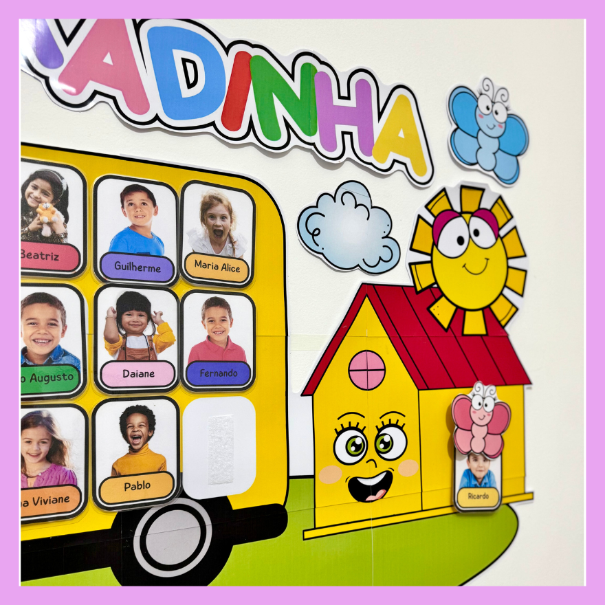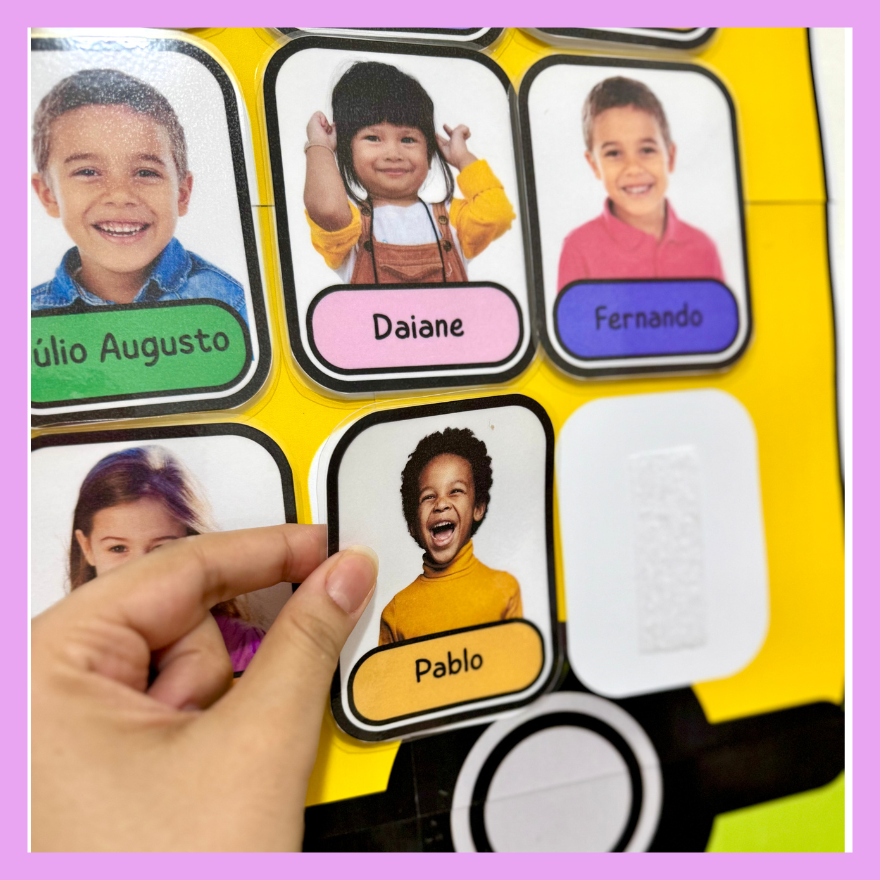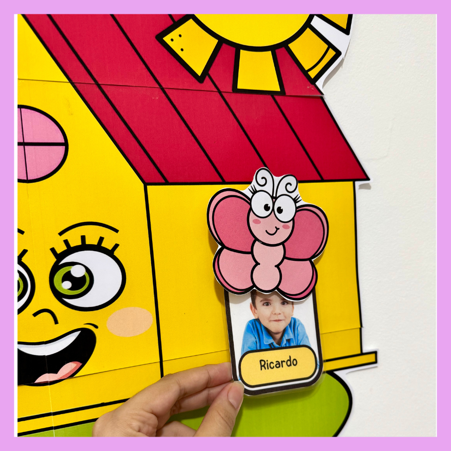 Nessa proposta as fichas das crianças presentes ficam no ônibus, e as fichas das crianças que faltaram ficam na casinha. Para prender as fichas na casinha utilizei prendedor de roupa.