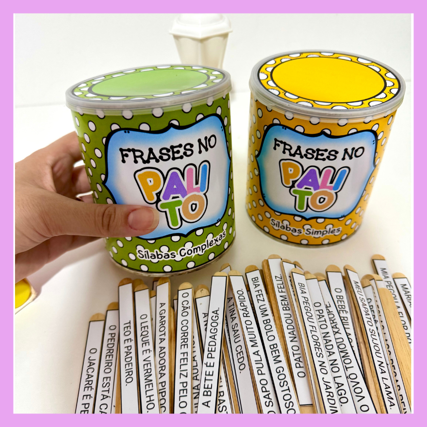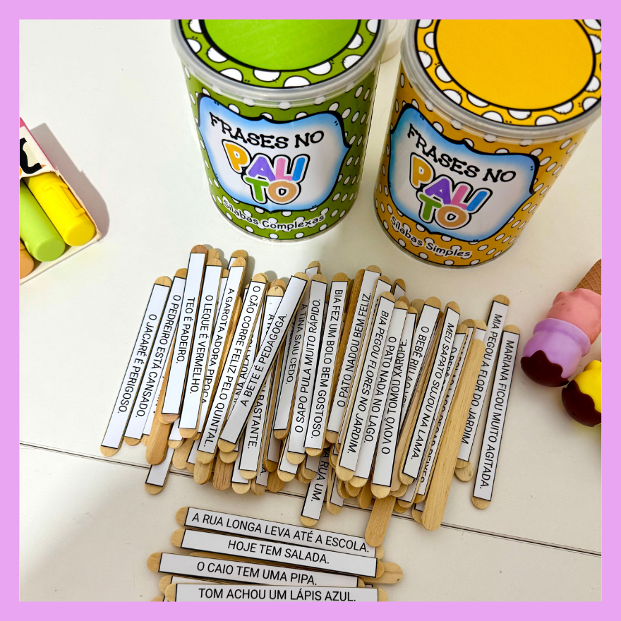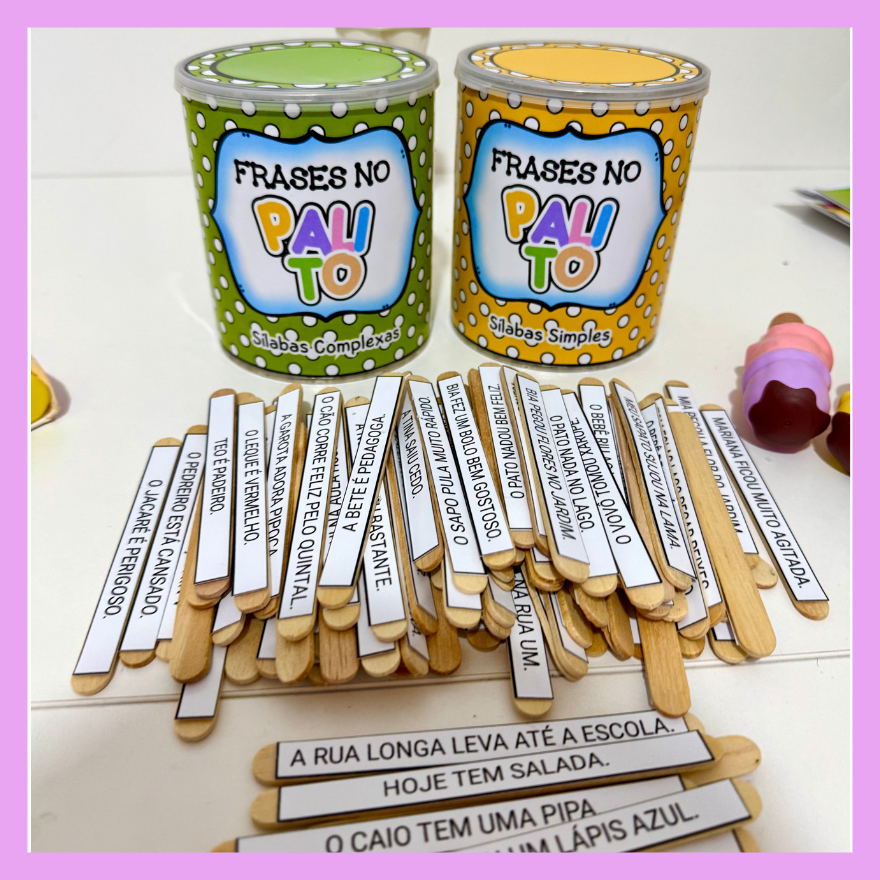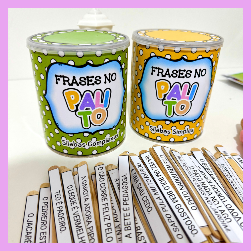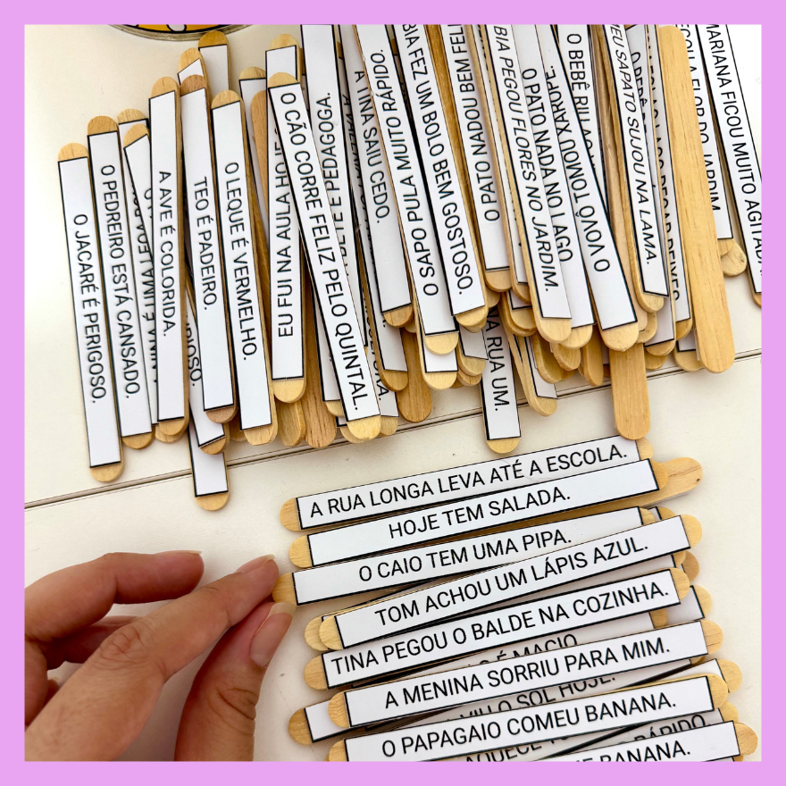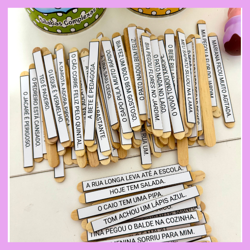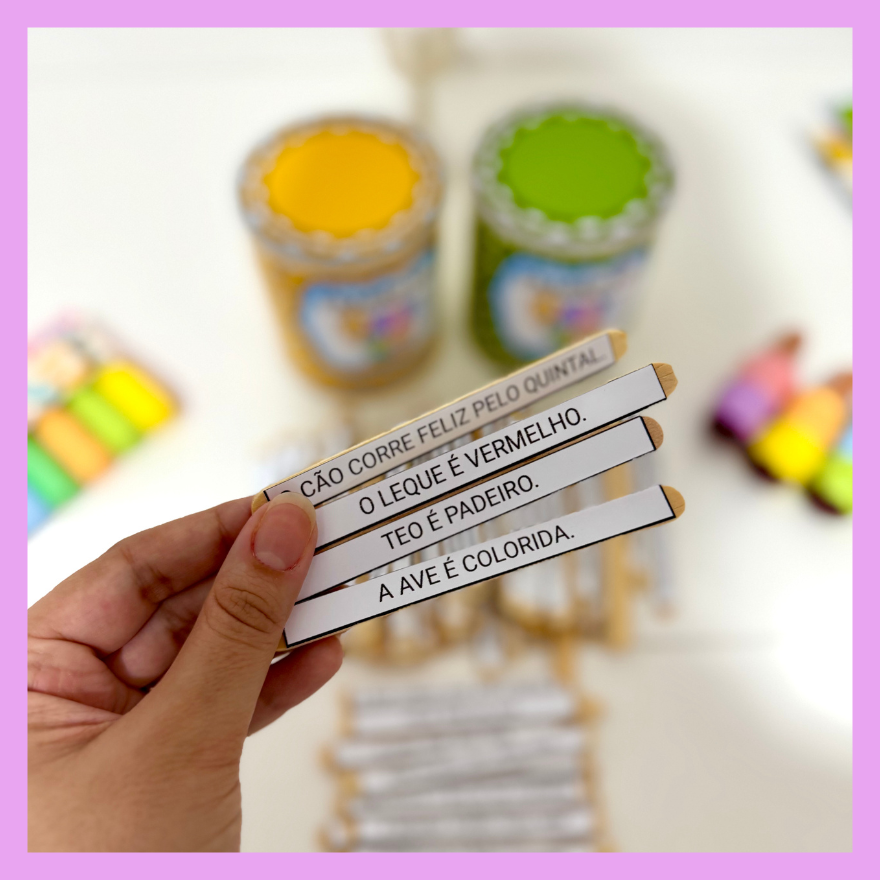 Material Frases no Palito ideal para ajudar as crianças em fase de Alfabetização a avançarem na leitura de frases. Coleção com mais de 100 frases para treino de Leitura.