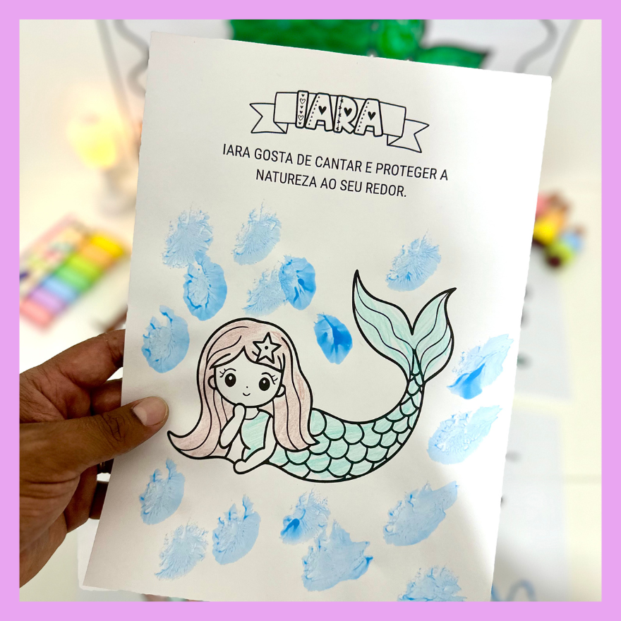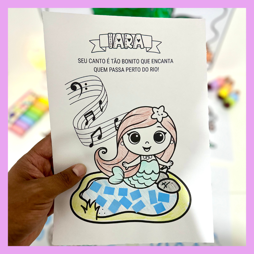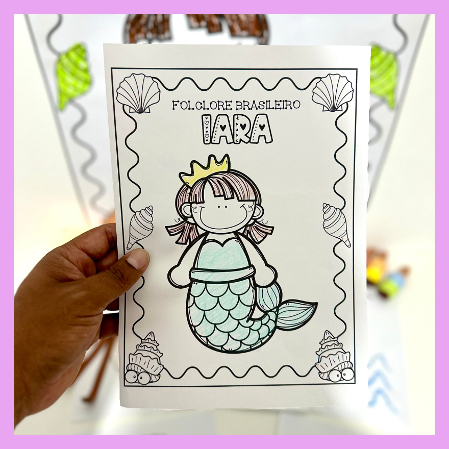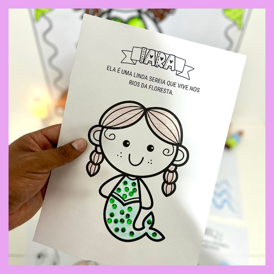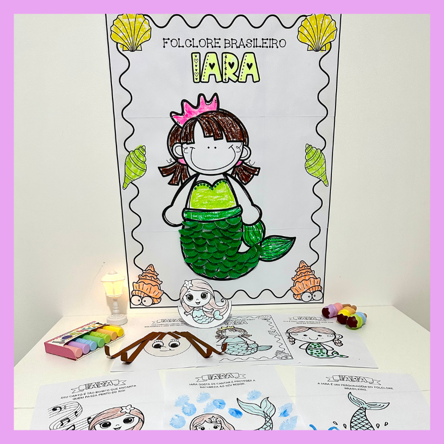 Kit de Cartaz colaborativo e atividades de Artes tema Iara- Folclore. O material inclui 7 propostas de atividades que trabalham criatividade e habilidades manuais, e também inclui um cartaz para realização coletiva, desenvolvendo coordenação motora fina além de trabalho em equipe e criatividade.