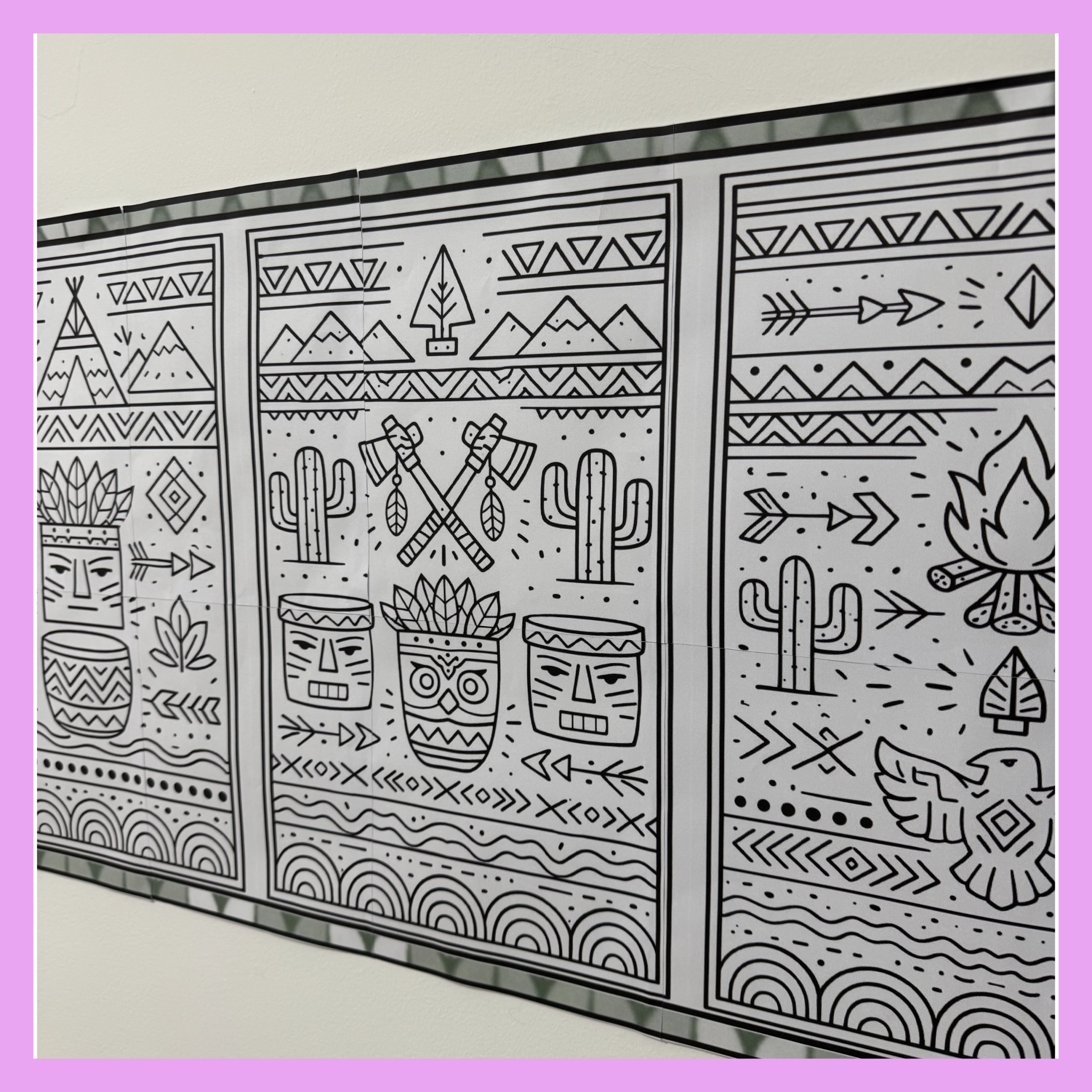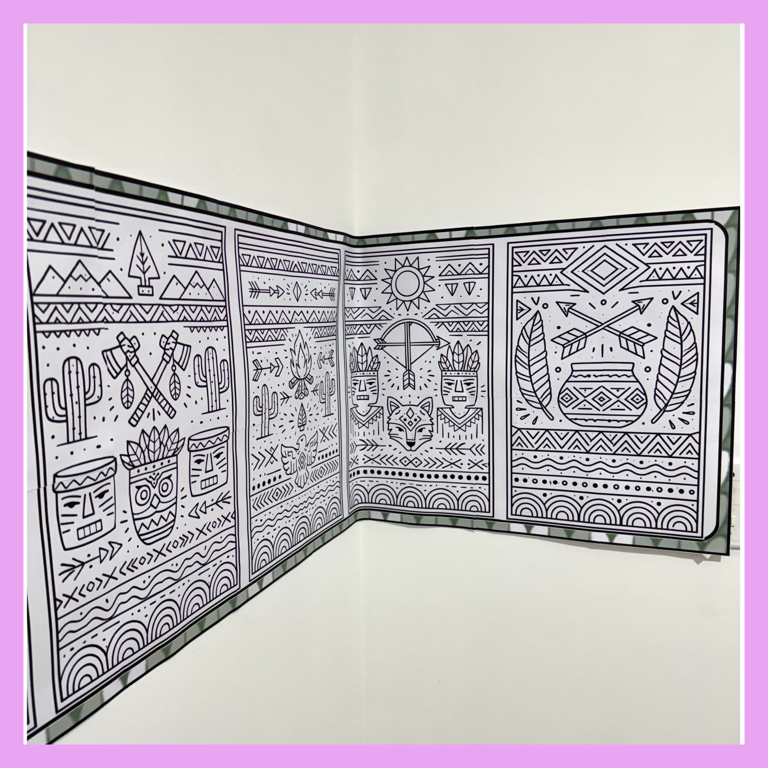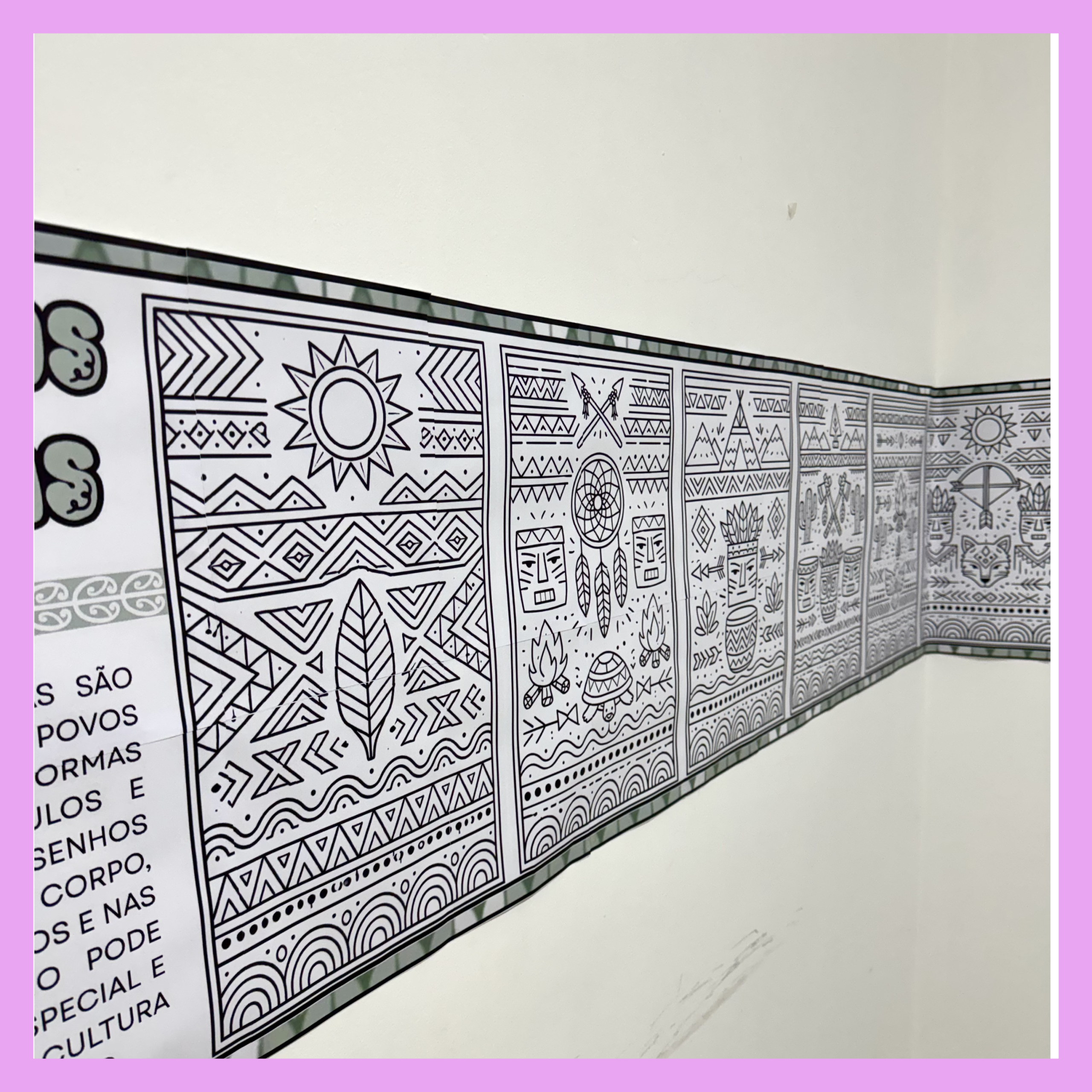 As crianças poderão colorir os grafismos indígenas, explorando formas, padrões e criatividade. Para enriquecer ainda mais a experiência, você pode utilizar tintas naturais, promovendo uma vivência mais sensorial e conectada com a natureza.