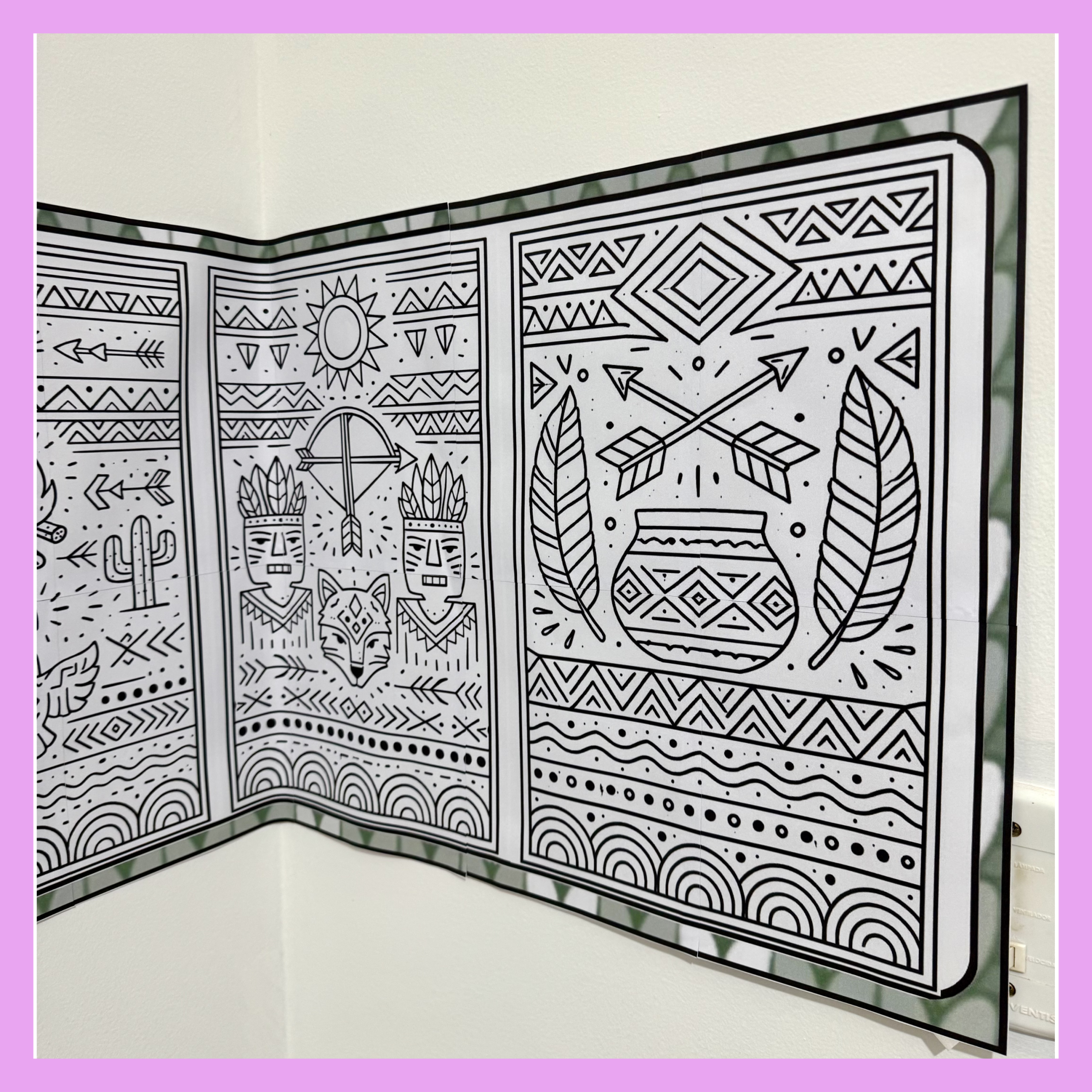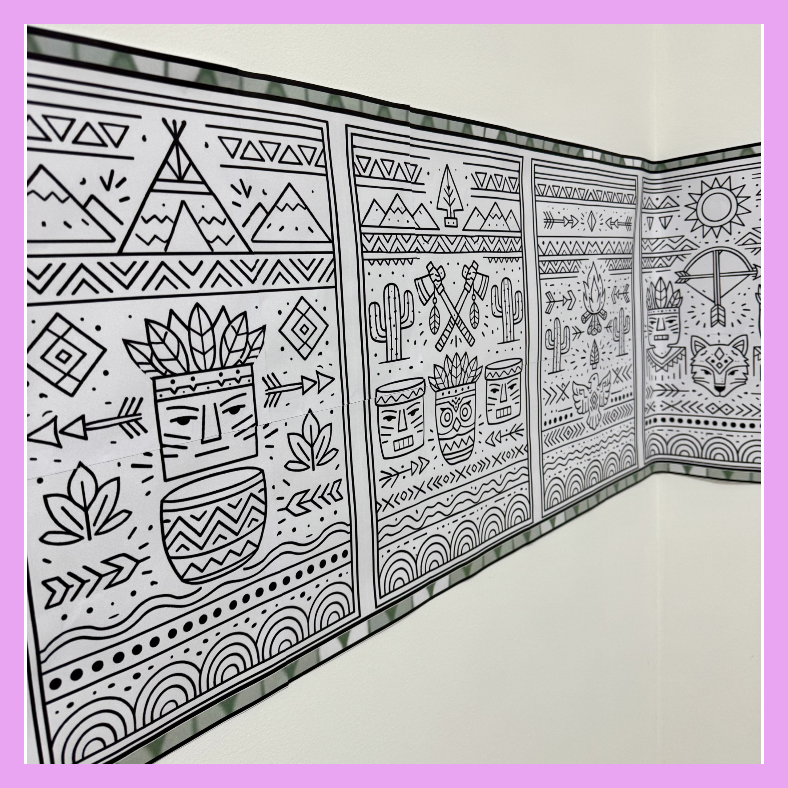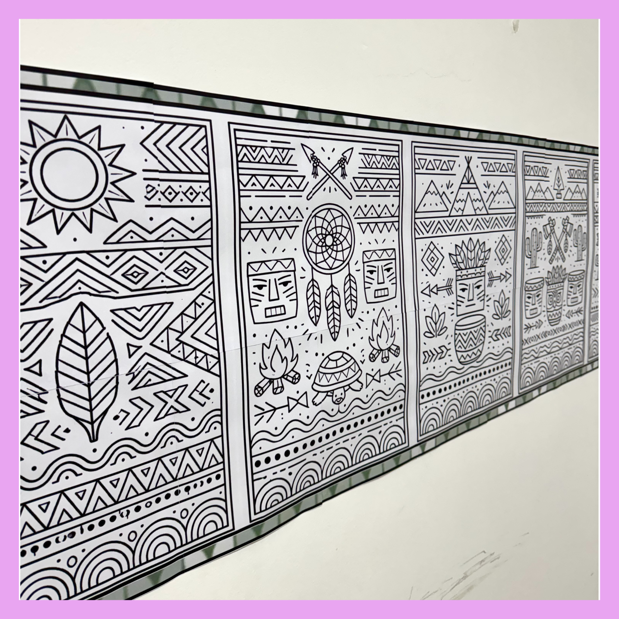 As crianças poderão colorir os grafismos indígenas, explorando formas, padrões e criatividade. Para enriquecer ainda mais a experiência, você pode utilizar tintas naturais, promovendo uma vivência mais sensorial e conectada com a natureza.